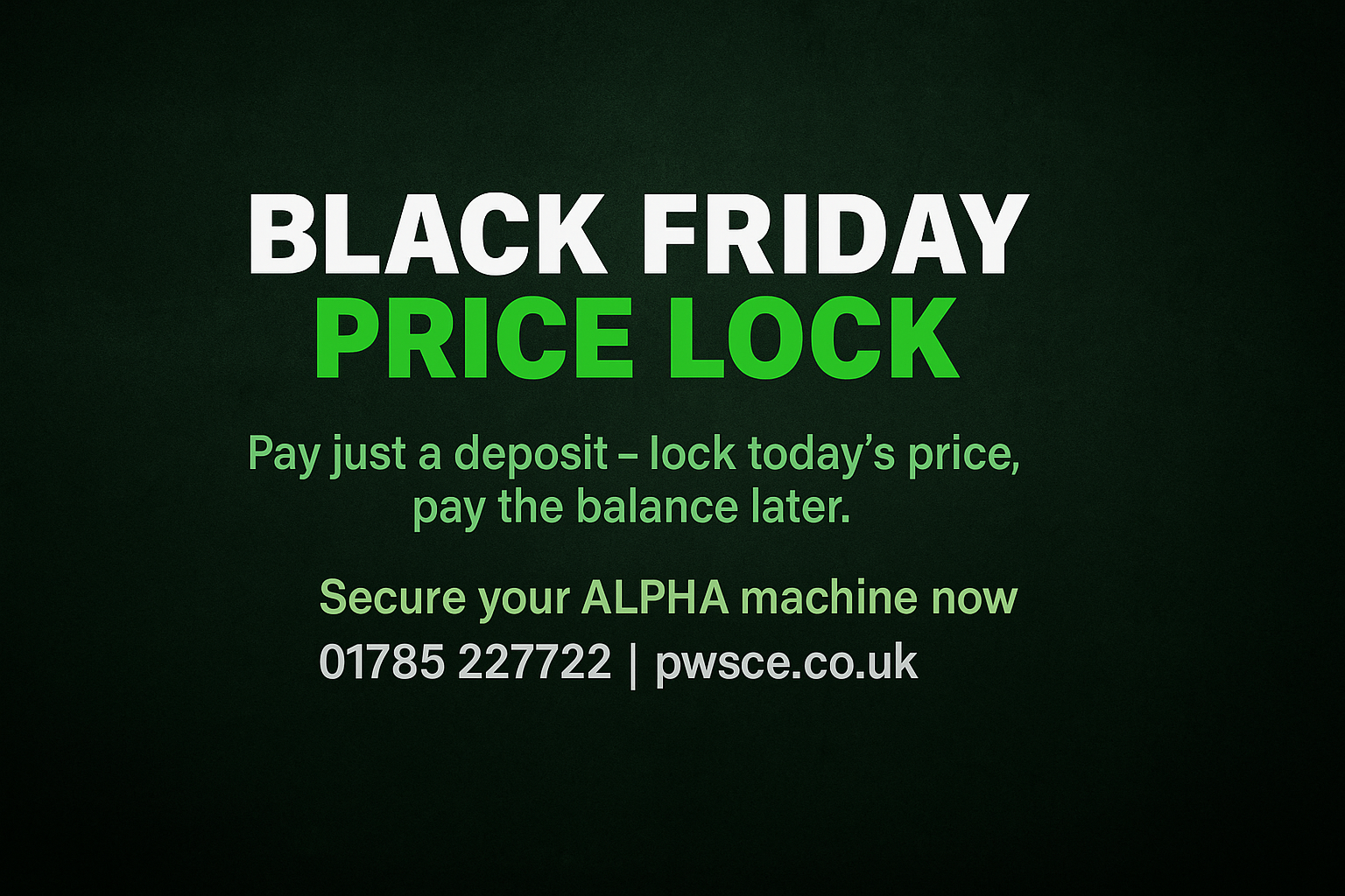 After listening to our customers and understanding that black friday comes at the wrong end of the season for purchasing equipment, we have come up with the SINGLE BEST DEAL this black friday …. order today and pay just a deposit to PRICE LOCK your order! Its that simple! No Jokes, frills or messing about. You can lock in the black friday prices, shield yourself from any price increases, pay the balance in the new year and collect… winner winner, chicken dinner!