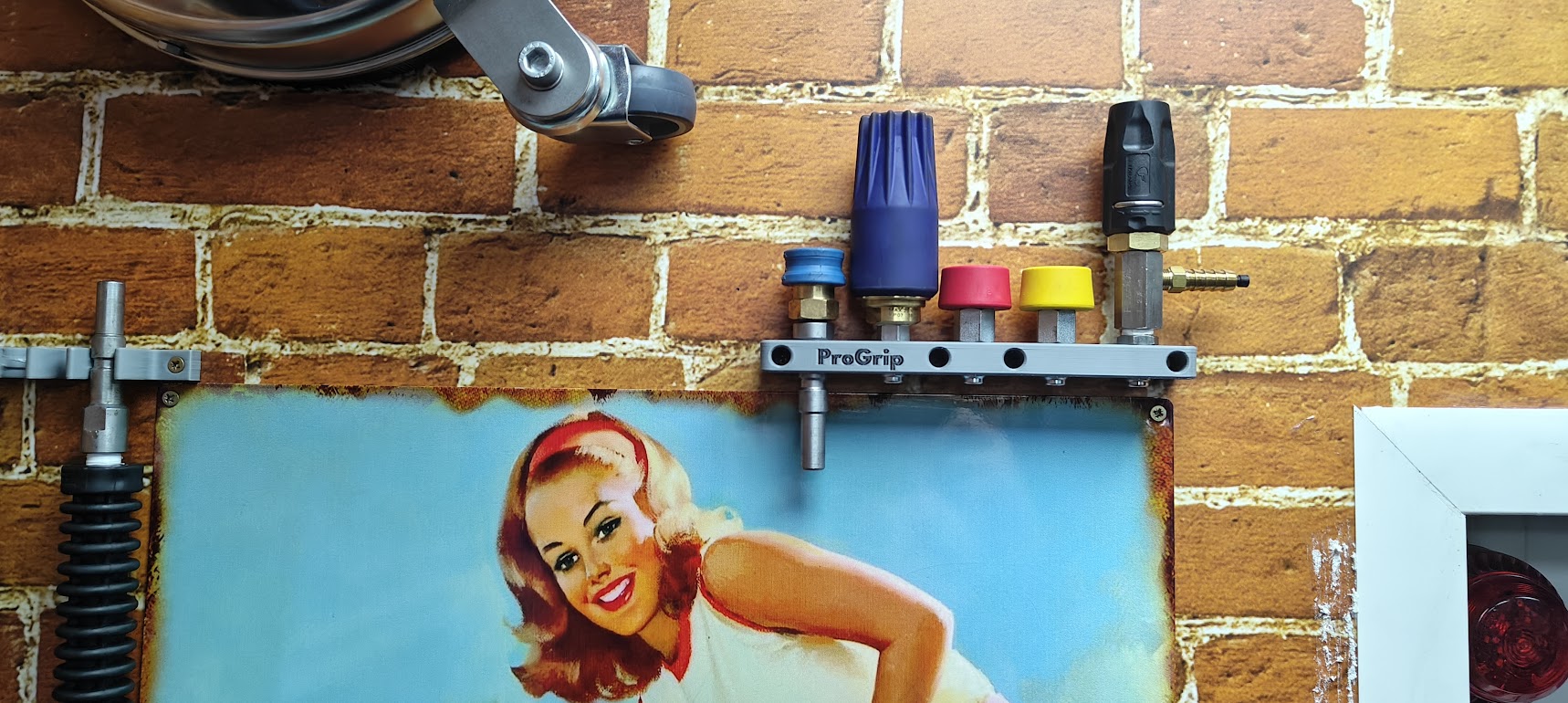 The ProGrip Multi-Holder is a compact, professional storage solution designed to keep your pressure washer accessories organised, secure, and always within reach. Precision-made with the Mini QR and KEW Spigot product range in mind, it’s the ideal companion for operators using Water Brooms, Turbo Nozzles, Sniper nozzles, and quick-release accessories.