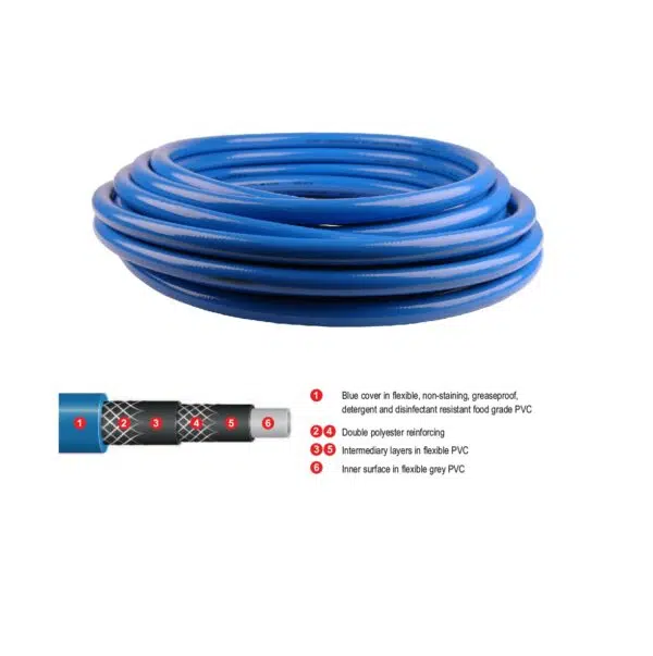 – Food grade hose for continuous use at up to 70°c / 40 Bar, or occasionally up to 80°c