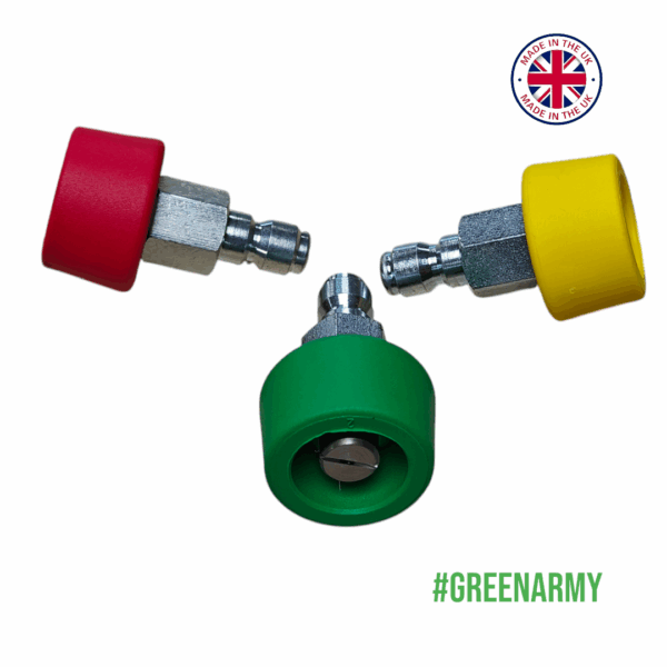 Low-pressure fan nozzles across a wide beam to dramatically increase coverage, meaning fewer passes over patios, driveways, car parks or other extensive flat surfaces. This fits between the Green and the traditional Black nozzle